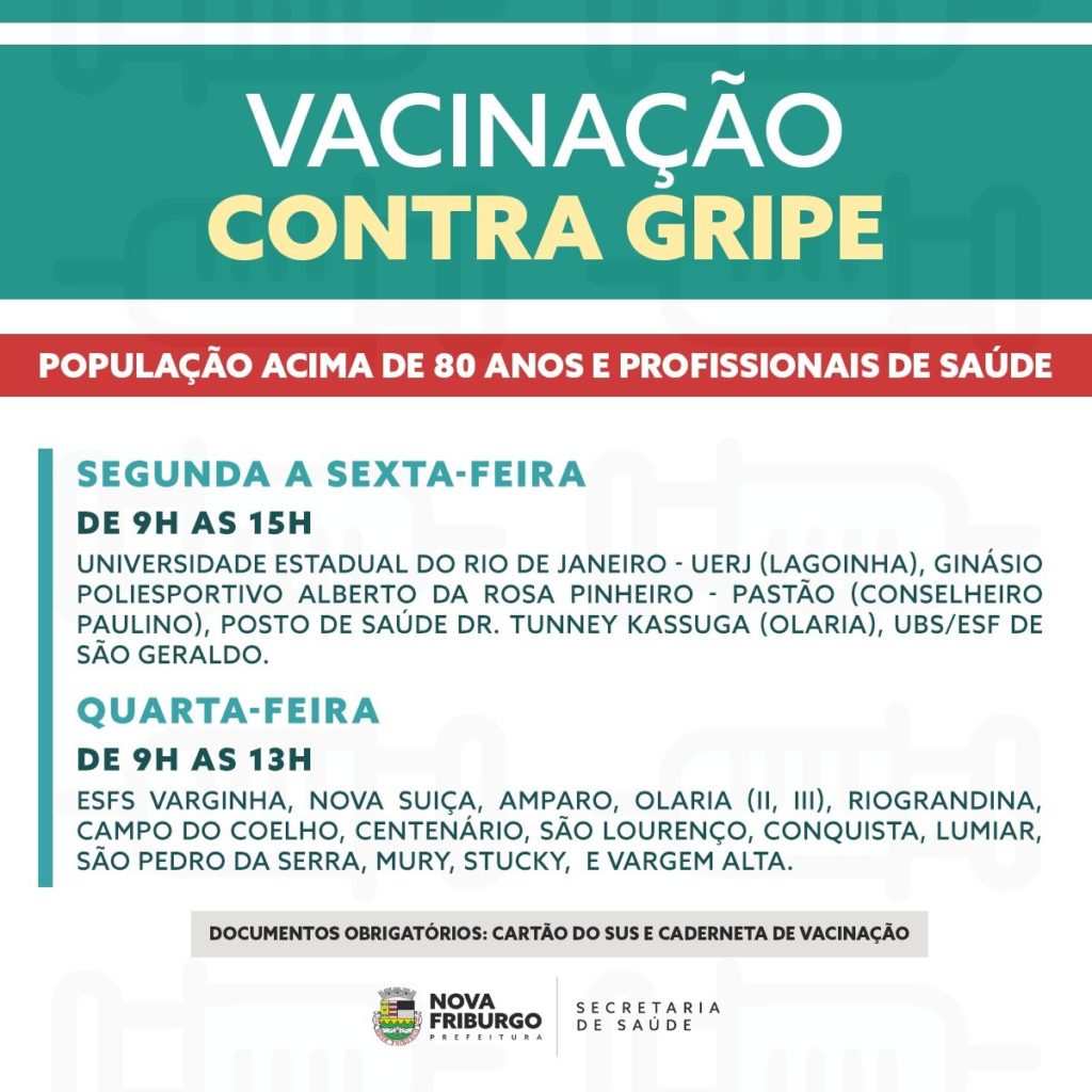 A Secretaria Municipal de Saúde, através da Coordenação de Imunização, iniciará a vacinação anual contra a Influenza em Nova Friburgo na próxima semana. A campanha contra a gripe tem início no dia 04 de abril, conforme o Ministério da Saúde preconiza.