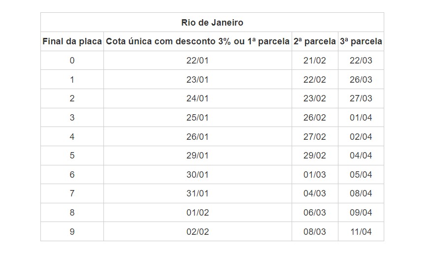 Começa na segunda-feira, 22 de janeiro, o calendário de vencimentos do IPVA (Imposto sobre Propriedade de Veículos Automotores) no estado do Rio de Janeiro. Assim como o Licenciamento, tratam-se de tributos anuais que garantem a regularidade do veículo para trafegar em vias públicas. Os motoristas devem ficar atentos aos prazos de pagamento estipulados, pois as datas variam de acordo com o final da placa de cada veículo. Confira as datas de vencimento para 2024 no Rio de Janeiro:
